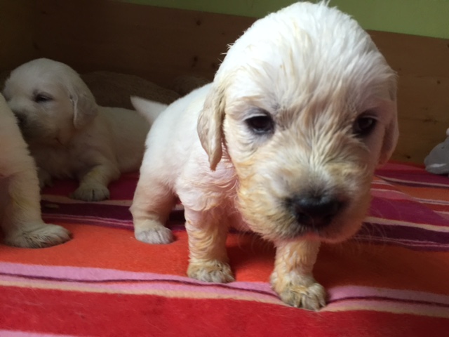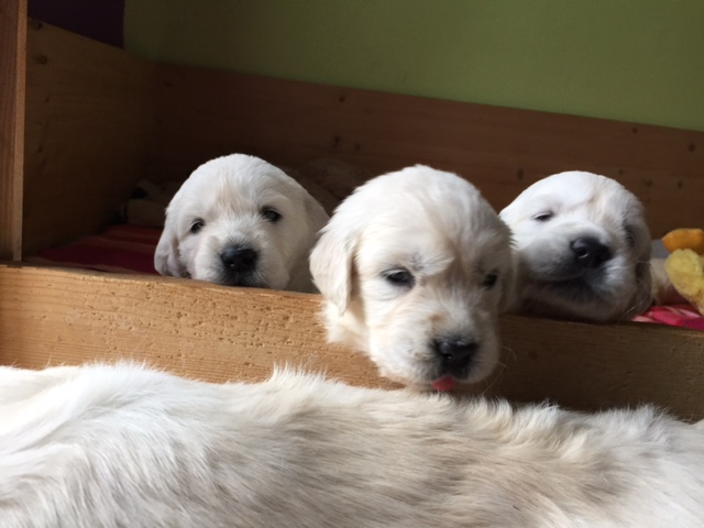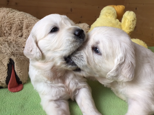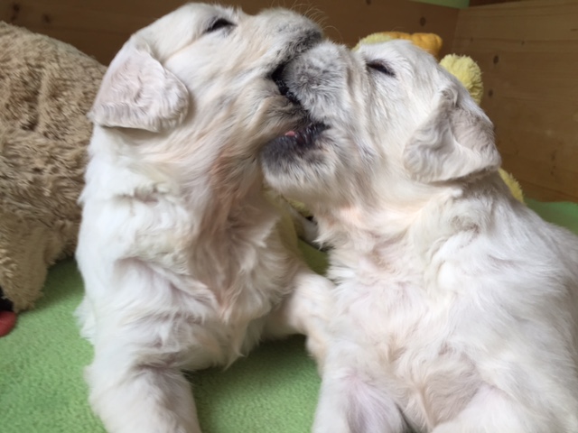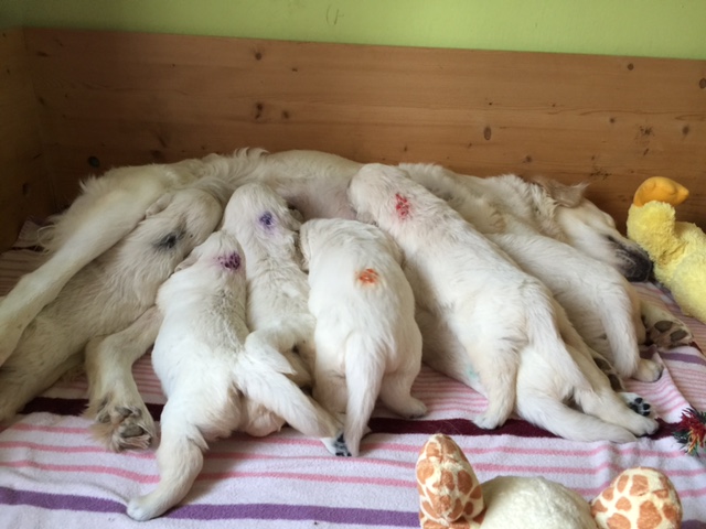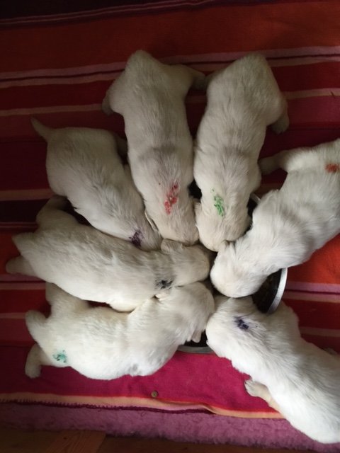 Halbzeit! Heute sind die Welpen genau 4 Wochen alt. Die kleinen dicken Mäusekinder haben grosse Fortschritte in ihrer Entwicklung gemacht und aus Ihnen sind doch tatsächlich kleine, spielende, bellende & rennende Hundchen geworden. Es gibt jetzt seit ein paar Tagen Welpenbrei oder/ und Ziegenmilch und es schmeckt allen vorzüglich.