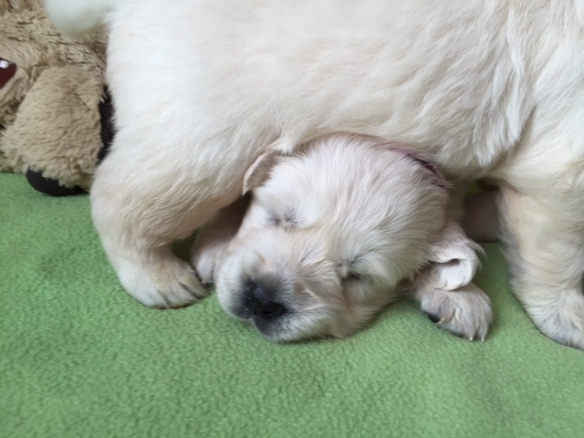 Es war auch die Woche in der unsere Junghündin Jaimie (selber gerade mal 14 Monate alt) stundenlang völlig fasziniert vor der Wurfkiste sas und ihr Welpen- TV genoss. Wann immer man Jaimie nicht finden konnte wusste man genau wo man suchen musste.