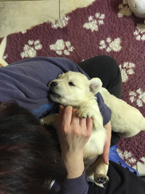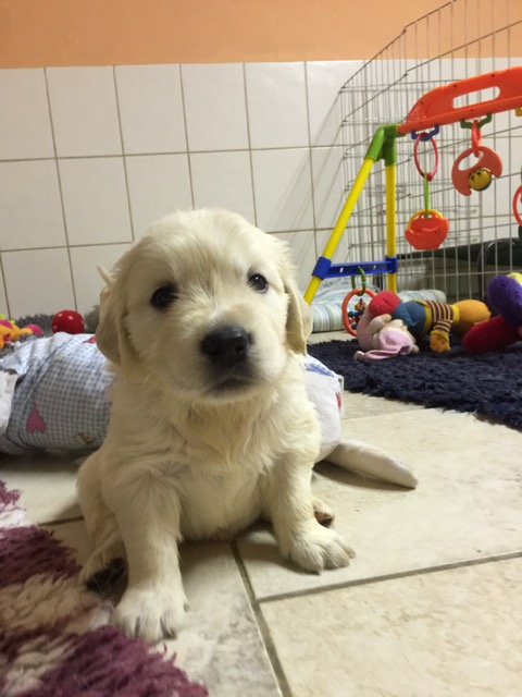 Sie kamen sahen und siegten! So oder so ähnlich könnte man den Einzug der Welpen vom Wohnzimmer ins Welpenzimmer beschreiben. Da man sie auf 30 qm aber wohl nicht mehr so leicht finden würde haben sie vorerst ein Drittel davon abgetrennt bekommen aber ich denke bald werden wir vergrößern müssen. Den Rest vom Welpenzimmer haben sie bereits mehrfach erkundet während ihr Abteil geputzt wird… von Angst oder Scheu keine Spur. Die bereitgestellten (für später!) Sozialisierung Spielzeuge fanden sie super interessant und haben sie ausgiebig erkundet. Bald kommen akustische Reize hinzu und ich bin gespannt wie sie darauf reagieren werden.