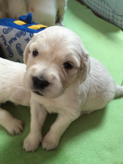 Bei allen 8 sind die Augen nun offen und langsam ähnelt auch die Optik mehr einem Hündchen als einem Mäuschen. Auch die Geräuschkulisse kommt hin und wieder einem „Wolf“ näher als der bisherigen Mäuschequietscherei. Siehe Beweis Video A!