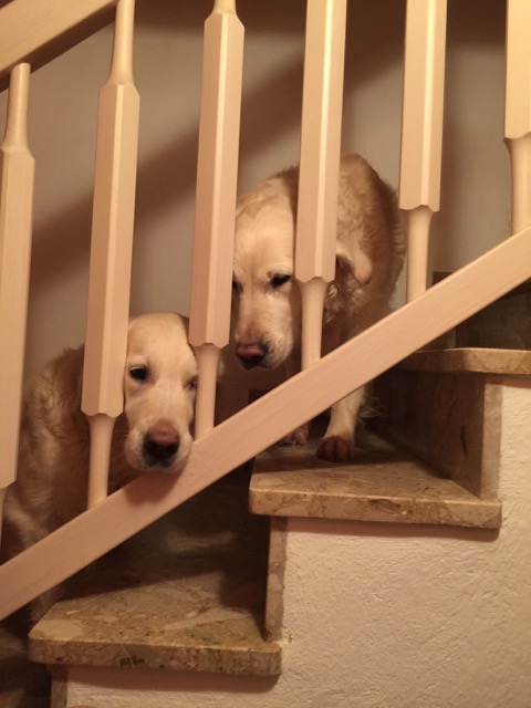 Die „Treppenhunde“ haben eigentlich nix in der Fotogalerie zu suchen- aber die Schnappschüsse entstanden gestern auf dem Weg vom Garten ins Bett -wo die 3 vergessen haben ihr Betthupferl bei mir abzuholen. Es sind übrigens Ruby & Cookie und deren Mama Emily in der Mitte.