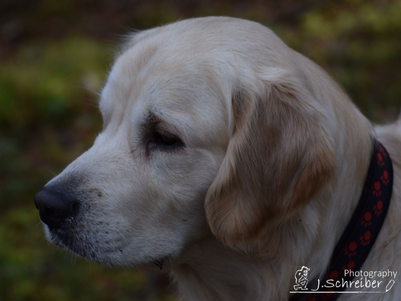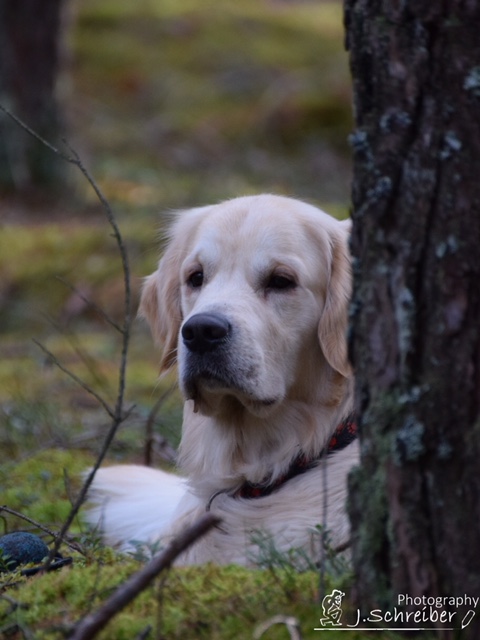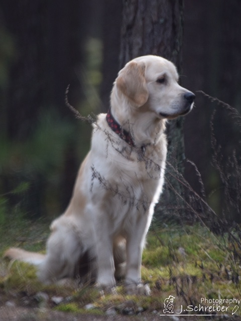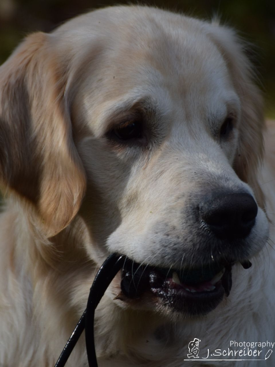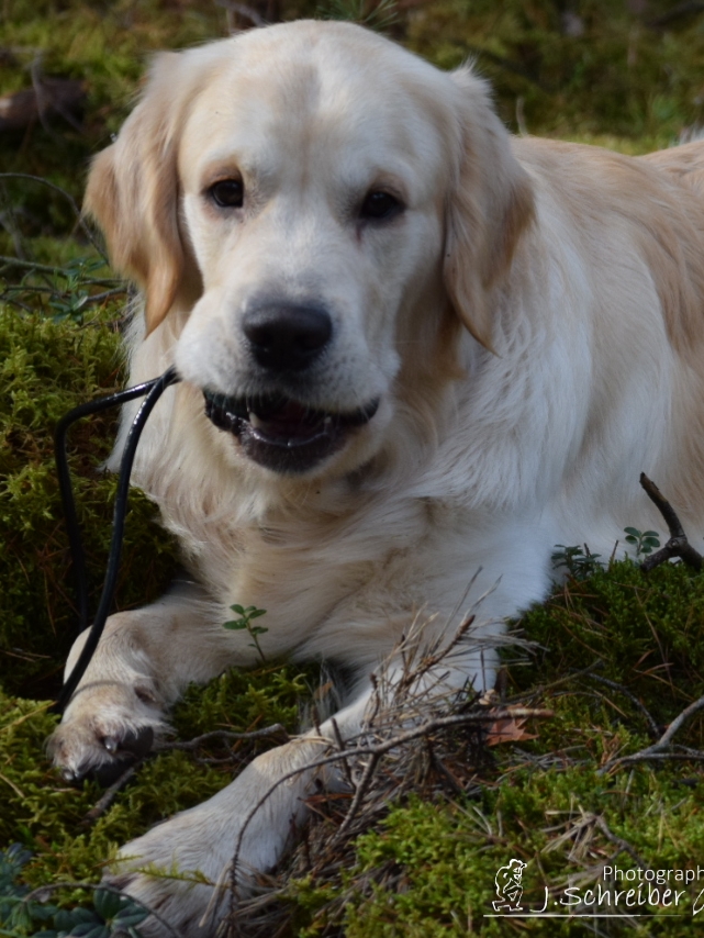 „Der 2 jährige Golden Rüde zeigt sich heute temperamentvoll und bewegungsfreudig. Er nimmt jedes Spielangebot freudig an. Sehr aufmerksam und ausdauernd läuft er meist unerschrocken durch den Test. Beute machen und spielerisch für sich tragen macht ihm viel Freude. Zutragen zeigt er uns heute nicht. Die Bindung zu seiner Besitzerin ist sehr eng. Er ordnet sich gut unter. Dies zeigt er vor allem bei den eingehenden Situationen. Im Kontakt mit Fremdpersonen ist er sicher, freudig und zutraulich. Bei Schuss sicher. Die optischen Reize erkundet er etwas vorsichtig, die akustischen Reize untersucht er begeistert. Ein freundlicher, interessierter Rüde mit sehr schönem Menschenbezug.“