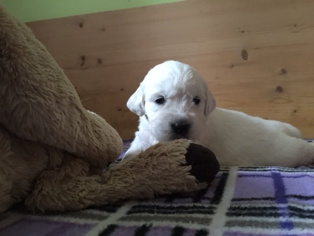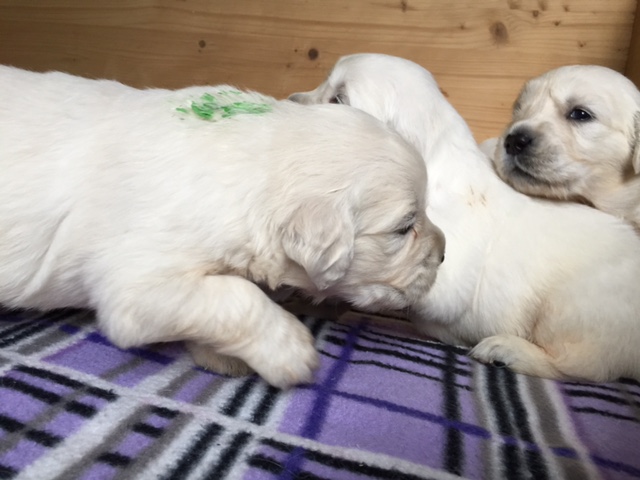 Täglich werden die Q’s aktiver. Sie spielen schon untereinander, knabbern sich gegenseitig an oder veranstalten gerne mal ein kl. Heulkonzert um ihre Mama anzulocken. Vorgestern gab es zum ersten mal Rindertartar und wie alle Welpen lieben sie ihren Mitternachtssnack. Aber nach wie vor gilt- nirgends schmeckts besser als bei Mama.